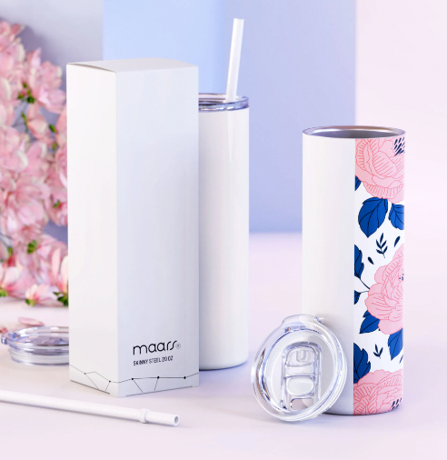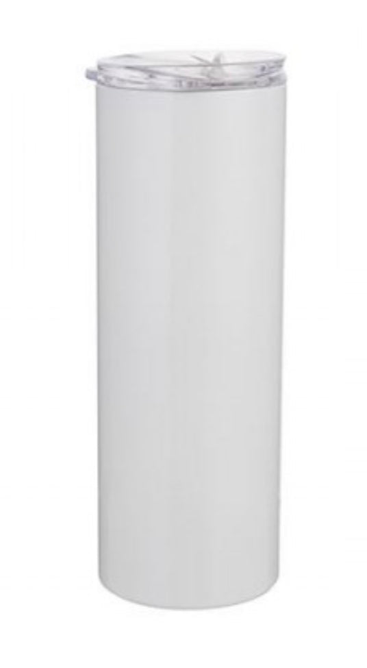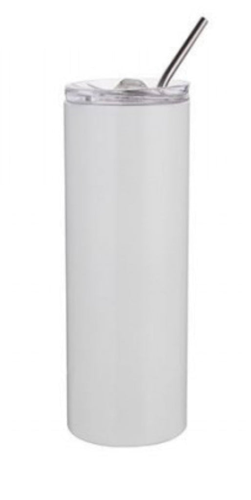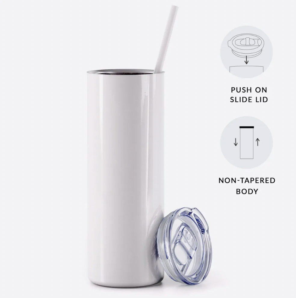Our 20 oz white gloss finish steel skinny sublimation tumblers feature a clear plastic push on lid with slide closure and bent metal straw. The lid features a rubber gasket for a tight secure seal.